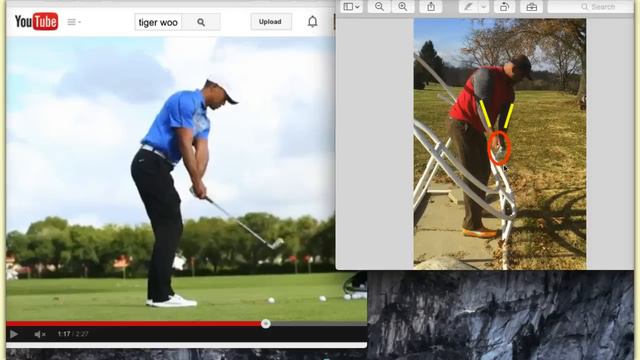 http://www.simpleswingthoughts.com Hey everybody we are going to breakdown Tiger Wood's new golf swing. The media has said that Tigers has gotten back to his basics from when he came on tour her back in 1996. So this is a good opportunity for us to use and breakdown Tiger's golf swing for our week #5 review video on the takeaway and the backswing. But before we start we're going to review the grip and posture that we should have before we hit any golf ball. It's the same positions that Tiger Woods uses for his golf swing. With the grip we grip the club with our left hand at the base of our fingers and place the thumb of the left hand at a about a 1 o'clock position on the club handle. We grip the club with the right hand underneath the club in the base of our fingers then we close our right hand and have a very strong grip. In the grip video of Tiger Wood's golf swing we say him positioning to get in these positions. Then we turn our wrist to the left where the V of our right hand are pointing toward the right shoulder. This puts us in a neutral golf grip. At this point our clubhead is closed, but we square the club face by putting the club head on the ground and tilting the shaft forward when we do this we actually square the club face to the ball. Now as we look at Tiger Woods new golf swing from behind on the backswing he becomes off the ball by not breaking the 144 ° from shaft set up. In this review we want to see the angle at address, which is about 144°, not to be broken as we come off the ball. When we take the club back we want to keep the angle between the forms and the club shaft at 144° until the club reaches parallel on the backswing on our target line. So the clubhead stays outside the hands until the club shaft reaches parallel on the backswing on your target line the hand in the club head do not form a straight line until position happens in the backswing. In Tigers golf swing backswing it looks like he takes the club back to the outside, but in reality he doesn't he's just trying to keep the club on plane so the club won't get stuck on the downswing. As we come to the top a Tiger Wood's new golf swing on the backswing we can see that he has a straight left arm and a flat left wrist and the right elbow that is at about 90° to the ground. From the top of his backswing we can see Tiger Wood's golf swing ready for power as he begins to now prepare for his downswing and his golf swing. Now what we're going to do is fast forward to Tiger Woods golf swing set up. We've covered the Takeaway and backswing and when you combine grip posture and the set up we're going to see how the two second golf swing now becomes very easy to perform. As you can see here from behind Tiger's set up has just a little more weight on his left leg so he can create that path of the Takeaway when it takes the club back. From the front view we can see tigers set up with his arms hands and shoulders in a triangle with his positioning at his feet ready to take the club back on the one piece Takeaway to get extension in the width box that's going to create the power in his downswing. In the background we see John Cook a Senior golfer on the senior PGA tour and when we look at John's golf swing we will see that he has the same basic grip and posture fundamentals as we all should. As you can see he takes the club back one piece take away Full arm extension so he can create his width box to prepare for his downswing without any extra movement. So let's learn from Tiger Woods new golf swing and these two PGA professionals. L yup you workoutet's know that we can get in the same positions as they can even though we may not get the same results right away with practice and positioning it's really up to us on how good we can get at this game that we love. http://youtu.be/Kqdu1P0dl28 http://youtube.com/simpleswingthoughts