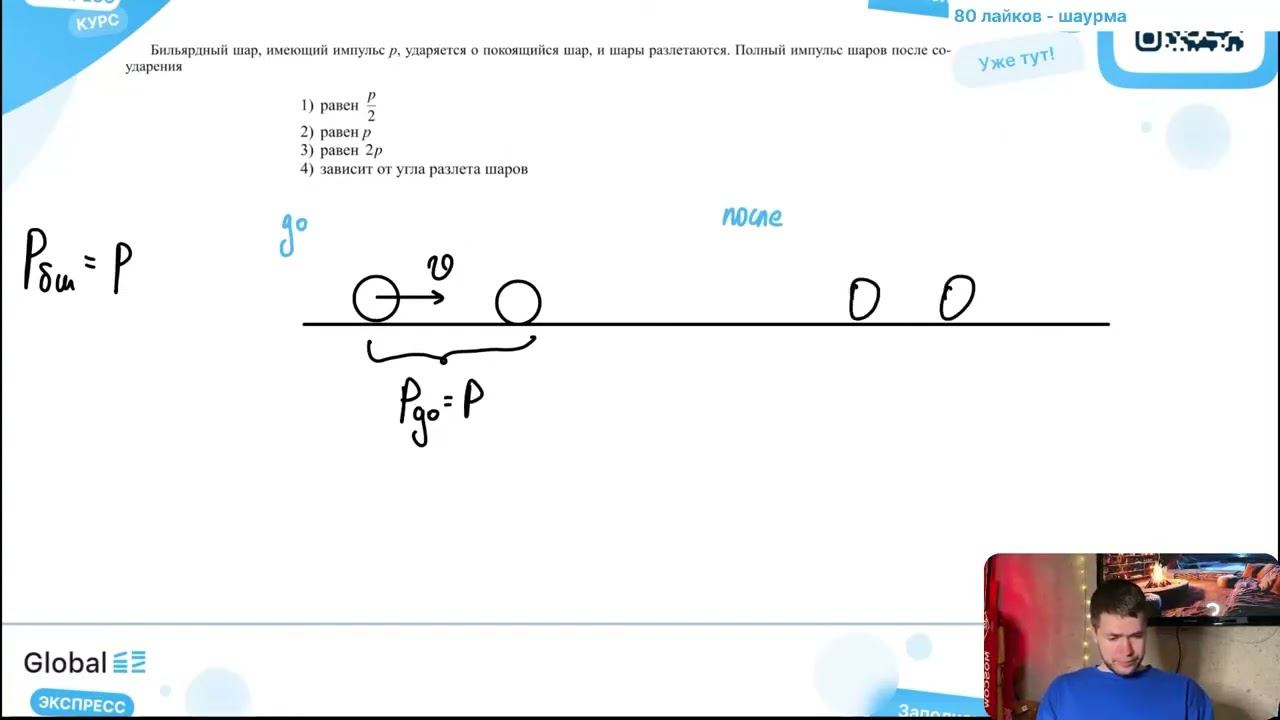 Бильярдный шар, имеющий импульс p, ударяется о покоящийся шар, и шары разлетаются. Полный - №