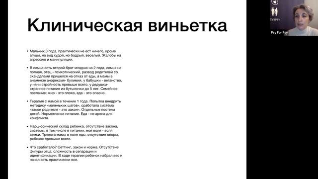 Доэдипальные конфликты в работе с РПП Основные зоны доэдипальных конфликтов и то, как их разрешения влияют на модели пищевого поведения. Ведущая Марина Куликова - клинический психолог, психоаналитик В продолжение лекции смотрите программу "От Эдипа до наших дней: работа с НПП в аналитическом подходе", 18 ак часов. Цель курса: обогатить практику с помощью инструментария психоанализа. Регистрация и подробности https://psy4psy.ru/psychoanalysis_ed Вы еще успеваете: 15, 17 и 19 февраля в 19:00 мск расширяем компетенции на курсе "От Эдипа и до наших дней" Тема модуля: Эдипов комплекс и другие концепции в работе с нарушениями пищевого поведения. Таймлайн 00:00 - Представление темы. 02:25 - Приветствие ведущей. 03:27 - Быть здесь. Что это за переживание. 05:00 - Психоанализ и РПП. Отсутствие присутствия. Проблематика внутреннего конфликта. 07:40 - Золотые стандарты лечения РПП. 11:47 - Школа влечений в лечении РПП: конфликты и защиты. Человек - существо поглощающее. 16:56 - Клинический случай с избирательным пищевым поведением ребенка. 20:55 - Амбивалентное отношение ребенка к матери. 23:35 - Метафора еды. 24:34 - Вытесненное женское. 25:40 - Ненавижу и люблю одновременно. Булимия как конфликт драйвов и влечений. Роль отца. 31:37 - Вопрос о ребенке, который выплевывает соску и слабо сосет грудь. 36:04 - Вопрос о манифестации анорексии в менопаузе. 38:11 - Вопрос о защите от эдипальных желаний. 39:14 - Вопрос о сроках лечения компульсивного переедания. Конфликт отвержения родительской фигуры. 44:55 - Вопрос о лечении аллергии психоанализом. Как понять, что это психосоматика? 49:00 - Вопрос о курении. 51:28 - Вопрос об отлучении от груди и другие вопросы. 56:16 - О чем будем говорить на курсе: концепции «образ тела»