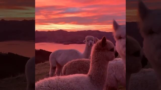 Альпаки встречают закат в Новой Зеландии.