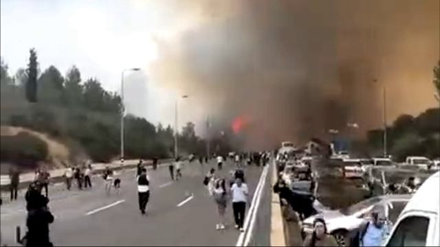 Люди бегут от приближающего пожара в Канаде