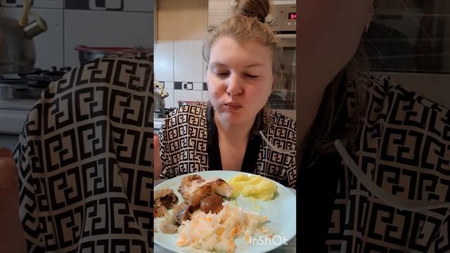 Мукбанг. Пюре с жареным окорочком, квашеная капуста, баклажаны в мед. мар., марин. грибы шиитаке