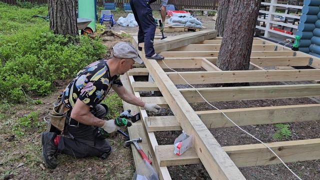 Делаем открытую терассу: основание из жб блоков, каркас из доски и бруса, отделка строганной квашеной доской 40х100х3000