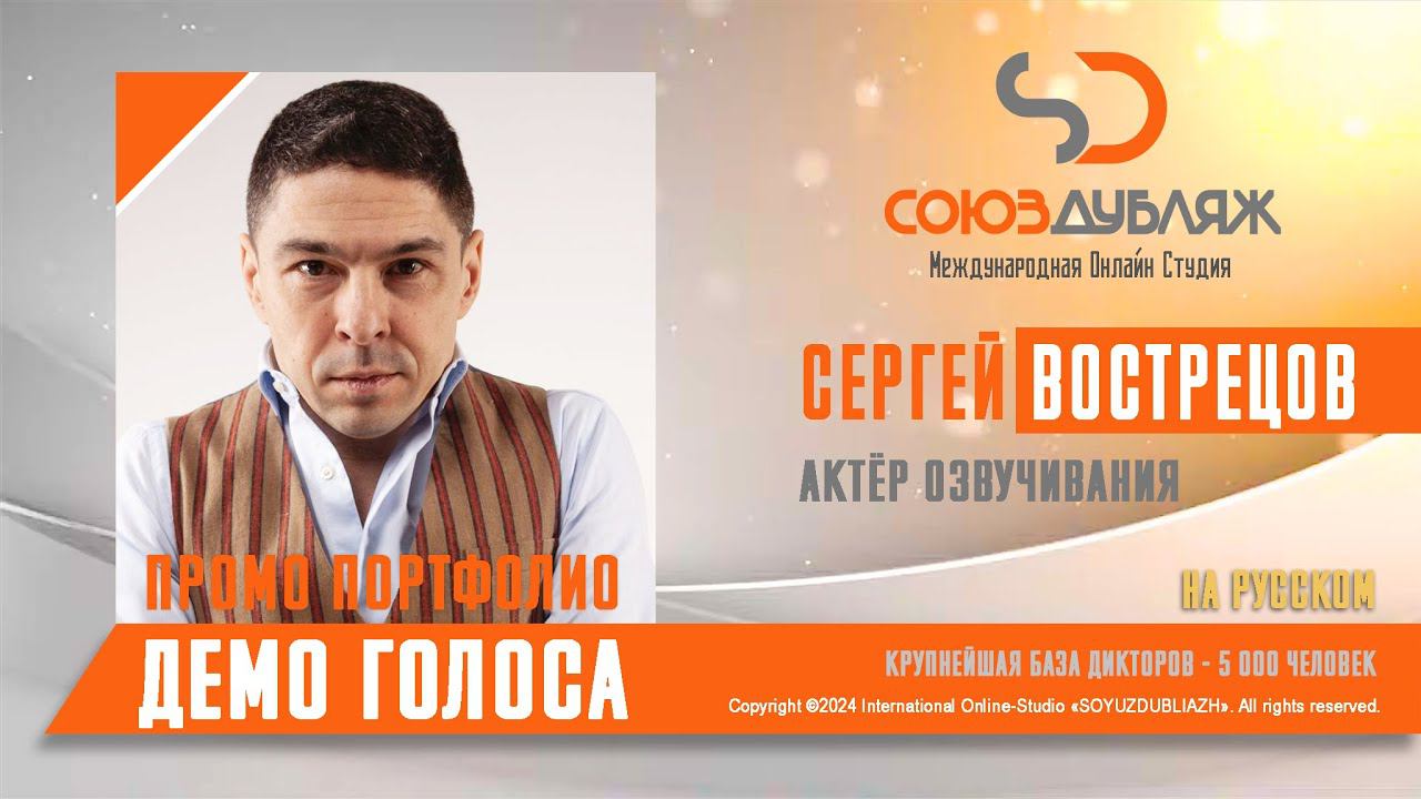 #СоюзДубляж #БазаДикторов #Озвучка ✔️Сергей Вострецов, актёр дубляжа - диктор озвучивания. Международная Онлайн-Студия "СОЮЗДУБЛЯЖ" - профессиональная озвучка и дубляж. ▪️Рабочая группа в Телеграм: https://t.me/soyuzdubliazh ▪️Контакт для связи: https://t.me/SoyuzAdmin ▪️Подпишись:https://www.youtube.com/c/SOYUZDUBLIAZH ▪️Сайт: https://www.soyuzdubliazh.com/ Лучшие голоса для вашей аудиорекламы и видеороликов. База дикторов - 5 000 человек, профессионального уровня на ENG| FR| TR| RU| ISR| AZ| UA| KZ| UZ| языках. Мужские и Женские топовые голоса для озвучки любых проектов, таких как: Рекламы, Презентации, Фильмы, Сериалы, Игры, Мультфильмы, ТВ Шоу, Аудио-видео визитки. ✔️Сотрудничая с нами вы получаете свой проект под ключ, не выходя из дома или офиса. Наша слаженная команда из лучших дикторов, актёров озвучивания, режиссёров и звукорежиссёров в кратчайшие сроки озвучат или отдублируют ваш заказ на профессиональном уровне. Образцы работ нашего портфолио вы сможете посмотреть на канале СОЮЗДУБЛЯЖ. ВНИМАНИЕ: ✔️Мы приглашаем специалистов озвучки к сотрудничеству в нашей команде. Вы можете пройти по ссылке в наш телеграм канал и связаться с Админом для обсуждения. ✔️Всем заказчикам подобных медиа проектов по озвучки и дубляжу фильмов, сериалов, документалок обращаться непосредственно к Админу Телеграм группы СОЮЗДУБЛЯЖ, пройдя по ссылке: Проходи по ссылке: https://t.me/soyuzdubliazh International Online-Studio SOYUZDUDLIAZH presents a highly professional approach in voice-over and dubbing. ▪️Our working group https://t.me/soyuzdubliazh ▪️Chief manager https://t.me/SoyuzAdmin ▪️Follow https://www.youtube.com/c/SOYUZDUDLIAZH ▪️Web: https://www.soyuzdubliazh.com/ We offer You the best Voices for your Audio commercials and Video`s. Our Database contains over 5 000 voices of native speakers and high-class foreign language specialists in ENG| FR| TR| RU| ISR| AZ| UA| KZ| UZ|. Male & Female top level voices for all the variety of dubbing projects such as commercials, presentations, movies, TV-series, video and computer games, cartoons, TV-shows, audio & video portfolio’s – all in one place. As your business partner we guarantee a turn-key project without you leaving your house or office. Our target is to make sure that the dubbing of your project is made as quick as possible by a well-coordinated and professional team of the best speakers, film and sound directors. To whom it may concern! We invite dubbing specialists to join our team. Please contact our manager on Telegram https://t.me/soyuzdubliazh