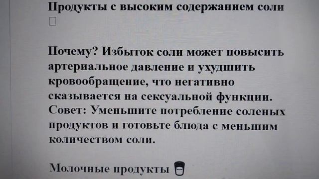 Привет, друзья! 🌟 Сегодня мы обсудим важную тему — какие продукты могут негативно повлиять на либидо и желание к интимным отношениям у мужчин и женщин. 👫 Правильное питание играет ключевую роль в поддержании здоровья и сексуальной активности. Давайте разберемся, какие продукты стоит избегать, чтобы сохранить свое либидо на высоком уровне. 💬 Продукты, уменьшающие либидо у женщин 🌸 Алкоголь 🍷 Почему? В больших количествах алкоголь может привести к снижению чувствительности и интереса к интимным отношениям. Он также может вызывать депрессию и усталость. Совет: Ограничьте потребление алкоголя и отдавайте предпочтение напиткам с низким содержанием алкоголя. Сладкие продукты и напитки 🍭 Почему? Сахарные продукты могут вызвать резкие колебания уровня глюкозы в крови, что приводит к снижению энергии и настроения. Совет: Уменьшите потребление сладостей и замените их фруктами и орехами. Жирная пища 🍟 Почему? Пища, богатая насыщенными жирами и трансжирами, может ухудшить кровообращение и привести к гормональным дисбалансам. Совет: Избегайте жареной и жирной пищи, выбирая более здоровые альтернативы, такие как запеченные или тушеные блюда. Соя и соевые продукты 🥡 Почему? Высокое содержание фитоэстрогенов в сое может нарушить гормональный баланс и снизить уровень тестостерона. Совет: Потребляйте соевые продукты в умеренных количествах. Фастфуд 🍔 Почему? Фастфуд содержит много соли, сахара и насыщенных жиров, что может негативно сказаться на общем здоровье и уровне энергии. Совет: Ограничьте потребление фастфуда и готовьте домашние, сбалансированные блюда. Продукты, уменьшающие либидо у мужчин 🌟 Алкоголь 🍺 Почему? Чрезмерное потребление алкоголя может привести к снижению уровня тестостерона и ухудшению эректильной функции. Совет: Умерьте потребление алкоголя и отдавайте предпочтение напиткам с низким содержанием алкоголя. Продукты с высоким содержанием соли 🧂 Почему? Избыток соли может повысить артериальное давление и ухудшить кровообращение, что негативно сказывается на сексуальной функции. Совет: Уменьшите потребление соленых продуктов и готовьте блюда с меньшим количеством соли. Молочные продукты 🥛 Почему? Некоторые молочные продукты могут содержать гормоны, которые могут влиять на уровень тестостерона и уменьшать либидо. Совет: Выбирайте органические молочные продукты или сократите их потребление. Жареная пища 🍗 Почему? Жирная и жареная пища может привести к ожирению и снижению уровня тестостерона, что влияет на либидо. Совет: Избегайте жареной пищи и выбирайте более здоровые методы приготовления, такие как гриль или запекание. Сладкие газированные напитки 🥤 Почему? Эти напитки содержат много сахара и пустых калорий, что может привести к увеличени