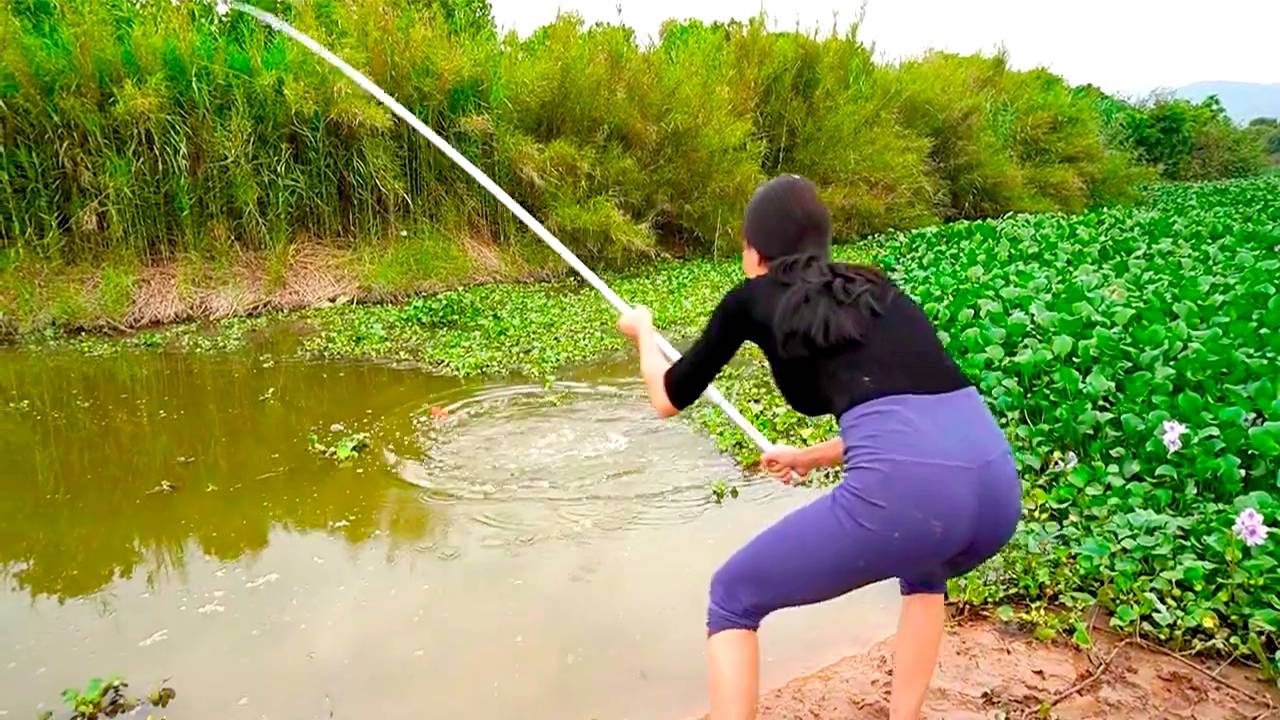 Рыбалка Красивая Девушка ловит крупную рыбу сома в заросшем пруду на удочку с поплавком