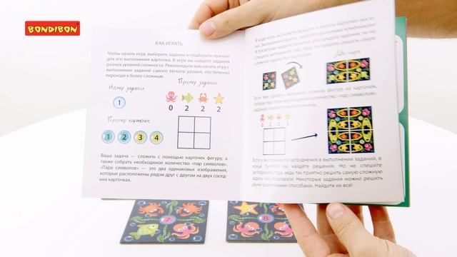 Кто проживает на дне океана? Головоломка «ПРИКЛЮЧЕНИЯ ОСЬМИНОЖЕК» из серии Бондилогика даст нам правильный ответ. А еще поможет развитию логического и образного мышления! Главное – соблюдать правила! Выберите задание, подберите для его выполнения нужные карточки. Дальше Вам нужно сложить эти карточки в геометрическую фигуру и собрать нужное количество пар изображений - осьминожек, рыбок, морских звезд или крабов. Вы можете вращать и менять карточки местами. Пробуйте различные комбинации! В игре 4 уровня сложности. Рекомендуем начинать с самого легкого, постепенно переходя к более сложным. В комплект входят 48 карточек из твердого картона с ярким принтом морских обитателей, буклет с заданиями и решениями. Игра рассчитана возраст от 4 лет. Количество игроков 1+. Разработка игры: Мурыскин Антон Вадимович. Выбирайте настольную игру ""ПРИКЛЮЧЕНИЯ ОСЬМИНОЖЕК"" Bondibon в подарок детям, которые любят решать интересные головоломки !