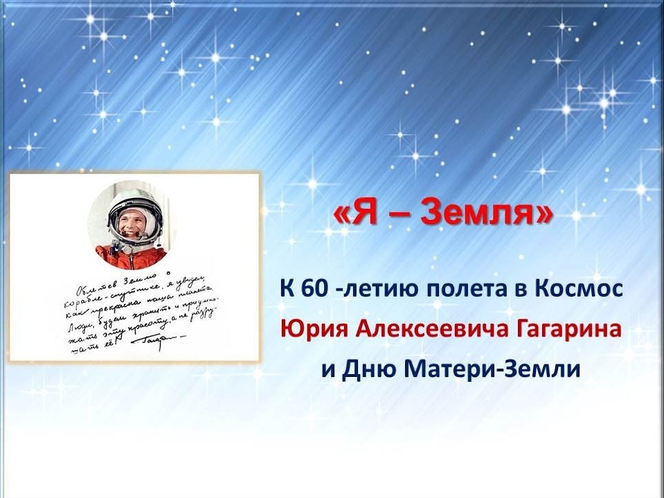 Вашему вниманию предлагаем видеопрезентацию «Я – Земля!», посвящённую и Дню космонавтики, и, неразрывно связанному с ним, Дню Матери - Земли, отмечаемому 22 апреля.