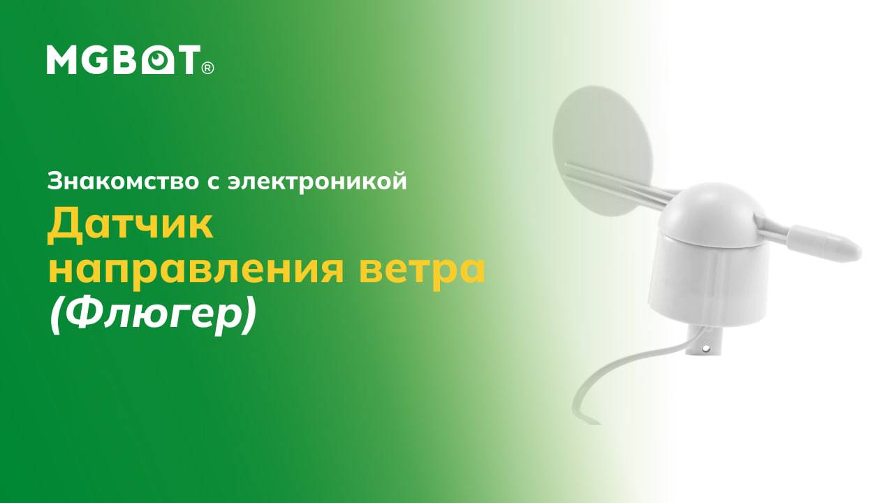 Флюгер — метеорологический прибор для измерения направления ветра. Направление ветра может определяться по горизонтальным штифтам, ориентированным по восьми румбам. Флюгер имеет восемь переключателей, каждый из которых подключен к отдельному резистору. Магнит лопатки может замыкать два переключателя одновременно, что позволяет указать до 16 различных положений (схема ниже). Внешний резистор можно использовать для формирования делителя напряжения, создавая выходное напряжение, которое можно измерить с помощью аналого-цифрового преобразователя. Применяется в наборе «Школьная метеостанция ЙоТик М2». Официальный сайт: https://mgbot.ru Вконтакте: https://vk.com/mgbot.official Telegram: https://t.me/Mgbotru Github: https://github.com/mgbotru/ По любым вопросам Пишите: info@mgbot.ru Звоните: +7 (812) 416 34 00