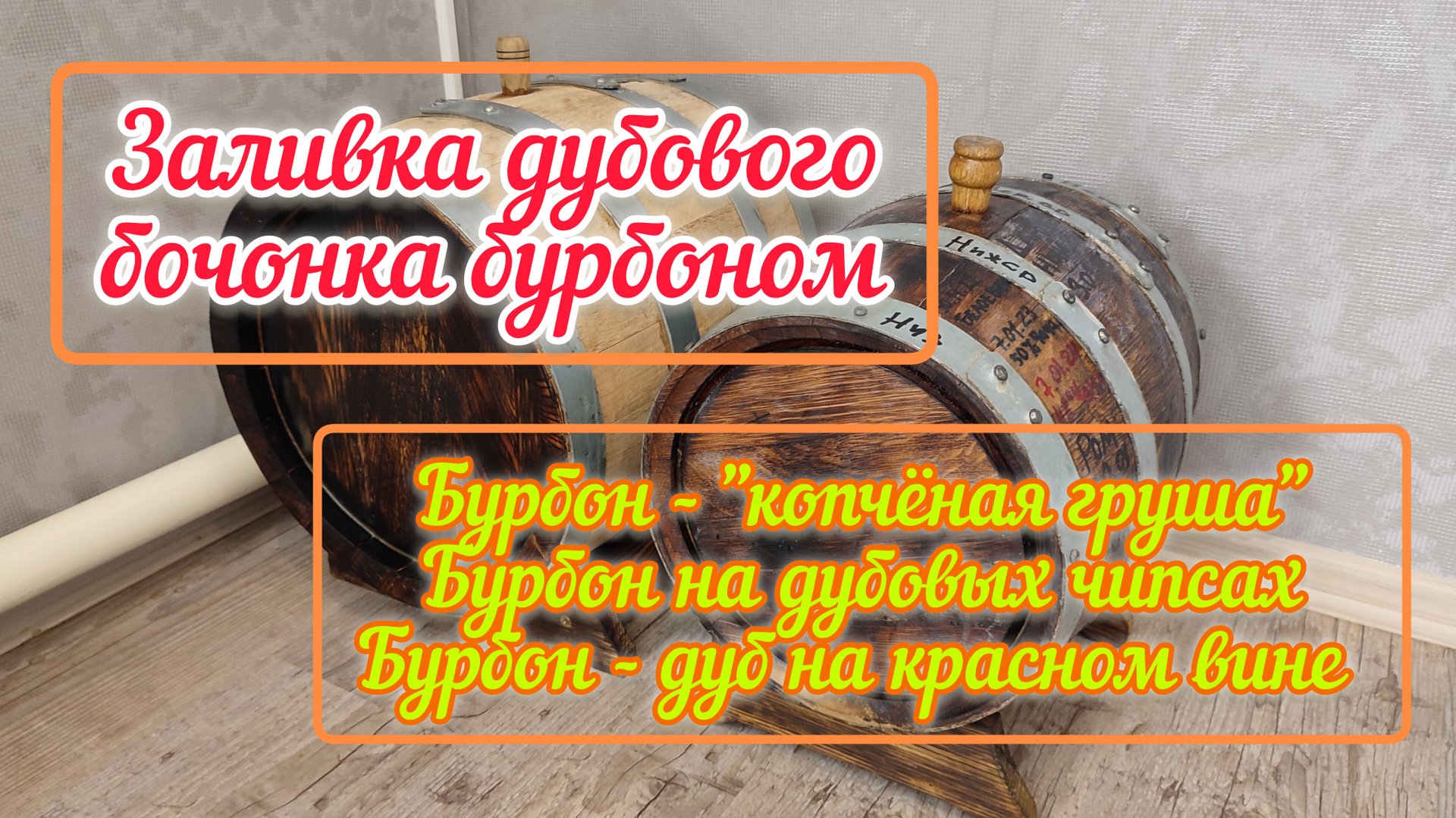 Бурбон из кукурузной, ячневой крупы с добавлением ржаной муки разделил на три равные части по 3 литра и поставил на дубовых чипсах, средней обжарки; дубовых кубиках и палочках, вымоченных в красном сладком вине из Монастреля и Саперави Северный и грушевых кубиках, сильной обжарки "копчёная груша" Бурбон из концентрата 14 литров залил на 4 месяца в 20 литровый дубовый бочонок. Через несколько месяцев дегустация и сравнение напитков. Себестоимость одной 0,5 л бутылки по разным рецептам. Подписывайтесь, чтобы не пропустить новые видео