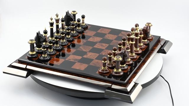 •Материал: обсидиан, бархат, бронза. •Техника исполнения: камнерезные работы, нанесение нитрида титана с помощью УВН (установка вакуумного напыление). •Размер доски 395*395*40мм, размер клетки 37*37мм, размер игрового поля 330*330мм, размер пешки 32*32*44мм, размер короля 32*32*87мм. •Вес в упаковке: 8,6кг. •Упаковка: подарочный ящик из дерева, размер 450*450*100мм. •Изделие в наличии при заказе вы получите образец, который представлен на фотографии. https://radugakamnya.ru/catalog/suveniry_iz_kamnya/suveniry_iz_obsidiana/shakhmaty_i_nardy_iz_obsidiana/shakhmaty_iz_obsidiana_395_395_40mm_v_podarochnoy_upakovke_1-613698/