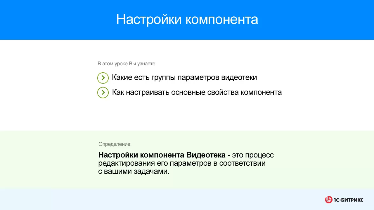 Настройки компонента Видеотека: - Какие есть группы параметров видеотеки - Как настраивать основные свойства компонента Видео к уроку "Настройки компонента" курса Контент-менеджер: https://dev.1c-bitrix.ru/learning/course/index.php?COURSE_ID=34&LESSON_ID=2203