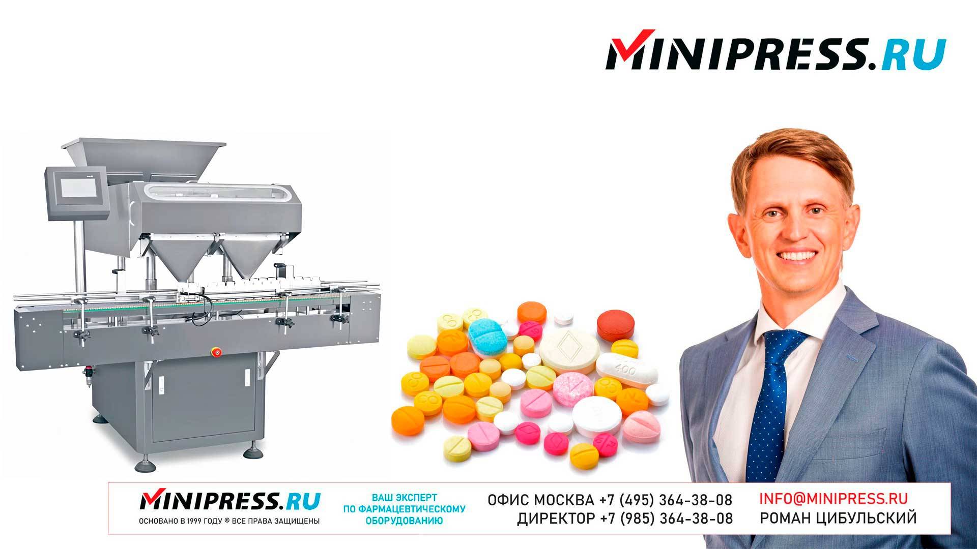 Автоматическая счетно-фасовочная машина для желатиновых капсул и таблеток TC-24 https://Minipress.ru/katalog/ Фармацевтическое оборудование. Специалисты в фармацевтическом оборудовании и технологиях производства лекарств. Более 18 лет оказываем нашим клиентам помощь в выборе, поставке, наладке различного фармацевтического оборудования! Вы в поиске надежного поставщика оборудования? Мы предоставим вам лучший сервис 24/7. Собрана лучшая команда профессионалов в фармацевтической отрасли и налажены стабильные связи с лучшими производителями. Мы не только продаем, но и производим многие модели оборудования Директор компании Минипресс Роман Цибульский Поставка фармацевтического оборудования в Россию Пишите: info@minipress.ru Телефон +7(495)364-38-08; Мобильный +375(29)308-00-00 Россия, Москва Skype: RomanTsibulsky; ICQ: 310-134-490 Подписывайтесь на наш видео канал на Youtube https://youtube.com/user/wwwMinipressru Обновленный сайт https://Minipress.ru Каталог оборудования https://Minipress.ru/katalog/ МЫ В СОЦИАЛЬНЫХ СЕТЯХ G+ https://plus.google.com/+RomanTsibulsky/ FB https://facebook.com/roman.tsibulsky YOUTUBE https://youtube.com/user/wwwMinipressru IN https://ru.linkedin.com/pub/roman-tsibulsky/a6/933/661 БОЛЬШОЙ КАТАЛОГ ФАРМАЦЕВТИЧЕСКОГО ОБОРУДОВАНИЯ https://minipress.ru/katalog/ Постоянно обновляемый каталог различного фармацевтического оборудования с фотографиями, описаниями, видео и ценами. ПЕРСОНАЛЬНЫЙ МЕНЕДЖЕР 24 ЧАСА https://minipress.ru/katalog/ Вы общаетесь по всем вопросам, с момента первой консультации и до получения оборудования, с одним специалистом. СПЕЦИАЛИСТЫ И ТЕХНОЛОГИ https://minipress.ru/katalog/ Имеем обширные связи в фармацевтической среде, найдем любого специалиста, поможем с освоением оборудования и технологий. ОБСУЖДЕНИЕ ВАШИХ ИДЕЙ ПО ПРОИЗВОДСТВУ ПРОДУКЦИИ https://minipress.ru/katalog/ Поможем в оценке ваших идей. Большой опыт в организации различных производств и выпуске продукции. Ценные советы. ФАРМАЦЕВТИЧЕСКОЕ ОБОРУДОВАНИЕ Мы поставили перед собой задачу, помогать нашим клиентам в правильном выборе фармацевтического оборудования. Многолетний опыт подобной деятельности показывает, что многие клиенты сталкиваются, в первую очередь, с непониманием технологического процесса. Покупка оборудования должна быть финальной точкой после подробного обсуждения задачи, консультацией с производителем оборудования, отправкой сырья и материалов на фабрику, тестирования в работе. ДЛЯ ТАБЛЕТОК https://minipress.ru/katalog/category/farmacevticheskoe_oborudovanie/ Смешивание порошков, гранулирование, прессование, обеспыливание, покрытие оболочками, фасовка, упаковка, счет, нанесение логотипов ДЛЯ ЖЕЛАТИНОВЫХ КАПСУЛ https://minipress.ru/katalog/category/farmacevticheskoe_oborudovanie/kapsulyatory-dlya-tverdyh-zhelatinovyh-kapsul/ Фасовка порошков и масел, обеспыливание, счет и фасовка, упаковка, нанесение логотипов. ФАСОВКА И УПАКОВКА https://minipress.ru/katalog/category/upakovochnoe_oborudovanie/ Упаковка в пластиковые и стеклянные флаконы, блистер, фольгу, ламинированную бумагу, стеклянные ампулы, саше, стрипы, тубы, тюбики, контурную ячейку. ТЕХНОЛОГИЧЕСКОЕ https://minipress.ru/katalog/category/eksperimentalnoe-oborudovanie/ Лабораторное, аналитическое, подготовительное, отдельные машины и линии под ключ. СФЕРЫ ДЕЯТЕЛЬНОСТИ Наша компания занимается множеством направлений фармацевтического бизнеса! Предлагаем Вам посетить страницы нашего сайта https://www.Minipress.ru по различным специализациям. ОБОРУДОВАНИЕ ДЛЯ НАКЛЕЙКИ ЭТИКЕТОК НА БУТЫЛКИ АМПУЛЫ ФЛАКОНЫ https://minipress.ru/katalog/oborudovanie-s-otzyvami/oborudovanie-dlya-naklejki-etiketok-na-butylki-ampuly-flakony/ Автоматическое этикетировочное оборудование дл