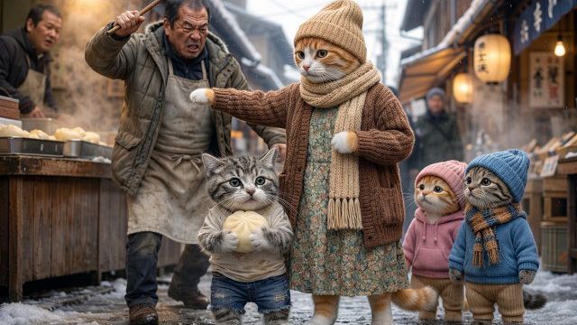 Украденная булочка и доброта Мамы Кошки с двумя котятами