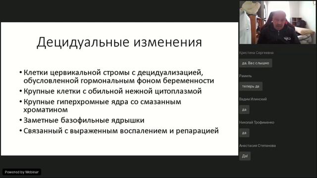 На вебинаре рассмотрены сложные случаи и вопросы дифференциальной диагностики следующих патологий: • Децидуальные изменения vs LSIL • HSIL vs плоскоклеточный рак • HSIL с вовлечением железистого эпителия • HSIL при атрофии и др. Вебинар будет полезен врачам и биологам, работающим с жидкостной цитологией ThinPrep и желающим познакомиться с технологией. Спикер: Кравцов В.Г., MD, PhD, MIAC, заведующий отделением Цитопатологии Медицинского Центра Меир, Кфар-Саба; заведующий отделением Цитологии Лаборатории “L.E.M.”, Нес-Циона, Израиль