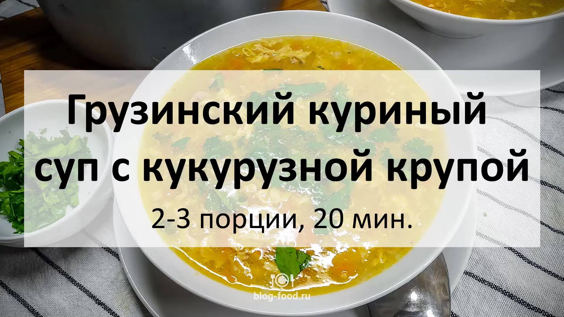 Всем привет. Сегодня сделаем интересный куриный суп. В качестве наполнителя нам послужит кукурузная крупа, частая для грузинских супов яичная заливка, ну и, естественно ароматная кинза. • Куриные бёдра, филе, 200 гр. • Морковь, 120 гр. • Лук, 1 шт. • Яйцо, 1 шт. • Кукурузная крупа, 50 гр. • Лимонный сок, 10 мл. • Чеснок, 2-3 зубца • Кинза • Лавровый лист • Паприка (острая или сладкая), по вкусу • Чёрный перец, растительное масло, соль Лук и морковь режем кубиком, курицу небольшими ломтиками, чеснок и стебли кинзы рубим мелко, яйцо взбиваем. В сотейнике разогреваем немного масла, обжариваем лук минуту на сильном огне, добавляем чеснок, морковь, и жарим ещё пару минут, добавляем курицу, обжариваем 2 минуты, периодически помешивая. Вливаем 600 мл воды или бульона, добавляем кукурузную крупу, паприку, стебли кинзы, лимонный сок, лавровый лист, солим, перчим по вкусу, доводим до кипения, варим 15 минут, вливаем яйцо, перемешиваем, прогреваем пару минут и снимаем с огня. Подаём с листочками кинзы. Приятного аппетита! Текстовая версия на сайте: https://blog-food.ru/1071