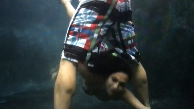 Купальщица проплывает между ног мужчины.
