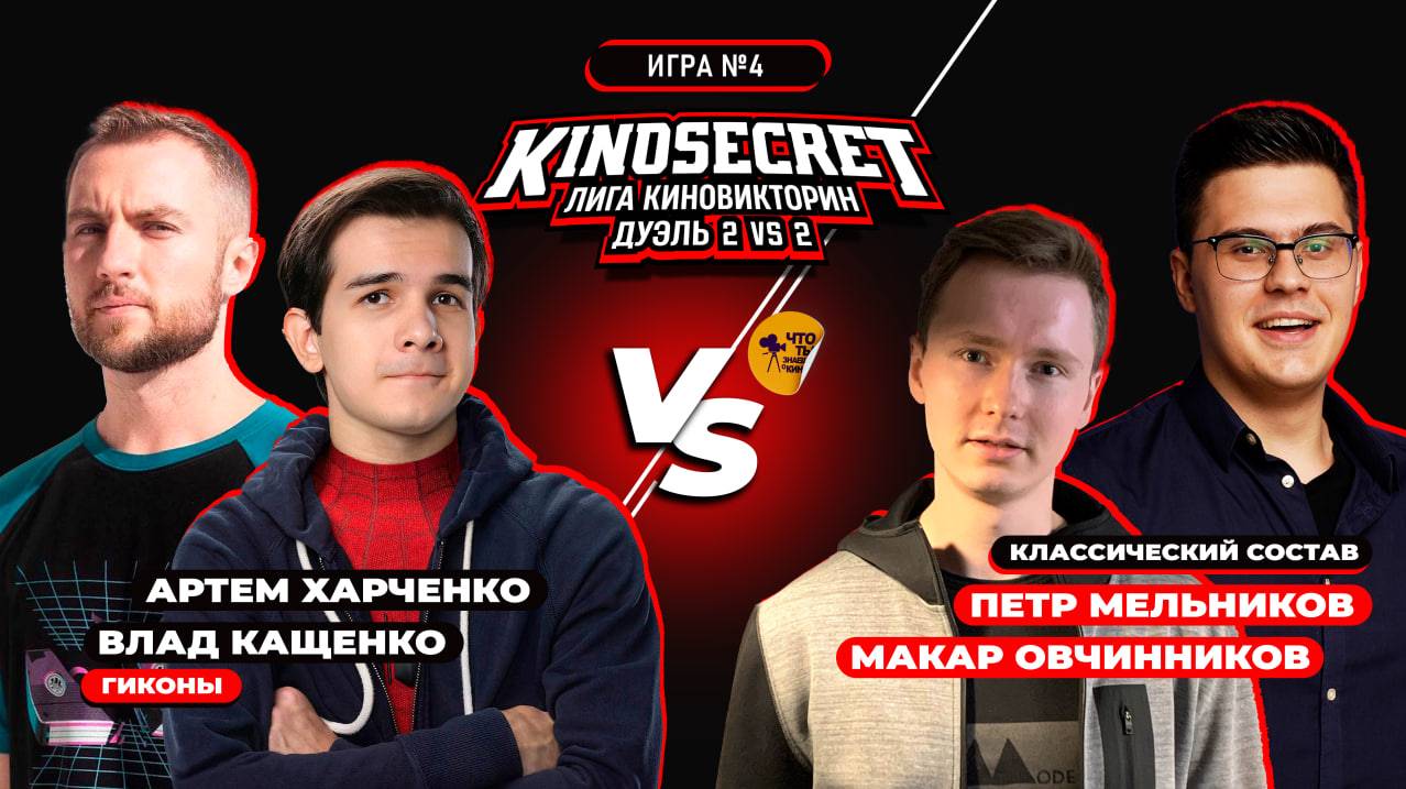 Лига КиноВикторин - большой проект, который объединяет киноманов со всего мира. Одним из форматов Лиги является игра КиноСекрет.Дуэль. КиноСекрет.Дуэль 2 vs 2 - это игра в которой участники игра в командах выясняют кто из них лучше всего разбирается в кинематографе. Участники 4-й игры спец.сезона среди блогеров: 1. Команда "Гиконы" - создатель канала "Qewbite": Влад Кащенко и автор канала "Cut the Crap": Артем Харченко 2. Команда "Классический состав" - киноблогеры и соавторы каналов Кино Огонь, Пожарная команда и Кино Огонь. Подкасты: Петр Мельников и Макар Овчинников За кого болеете вы? -------------- Звук в игре от Kazaku Records Аранжировки , сведение , мастеринг 🎵 🎤 🎧 https://www.youtube.com/channel/UCMPnxwJV2h5RideLcKU7cHw -------------- Монтаж выпуска - Степан Пинигин - https://t.me/sp_videomaker https://www.instagram.com/stepan.pinigin/ ------------- Если вы хотите поддержать наш проект, это можно сделать по ссылке: https://boosty.to/kinosecret/donate Если вы хотите, чтобы ваши вопросы прозвучали в одном из ближайших выпусков, отправляйте свои наброски на почту - info@kinosecret.com Если вы хотите принять участие в записи Своей Игры среди подписчиков канала, выполните действия, которые описаны в этом видео - https://youtu.be/AYPrJH0AJ_I -------------- Таймлайн: 00:00 - Вводная информация об игре 03:37 - Приветствие игроков 12:57 - Первый раунд 26:33 - Второй раунд 42:37 - Третий раунд 56:06 - Четвертый раунд -------------- Наш телеграм канал - https://t.me/QuizKinoSecret Наш сайт - http://www.kinosecret.com/ Наши игры в Иркутске - https://vk.com/kinosecret Наши подкасты - https://kinosecret.mave.digital/ Наш инстаграм - https://www.instagram.com/kinosecret_quiz/ Наша группа в ВК - https://vk.com/kinosecret_russia По условиям франшизы - http://www.kinosecret.com/franshisa/ -------------- #киносекрет #KinoSecret #свояигра #квиз #quiz #квизонлайн #квизкино #киноквиз #квизкиноимузыка #викторина #киновикторина #онлайнкиноквиз