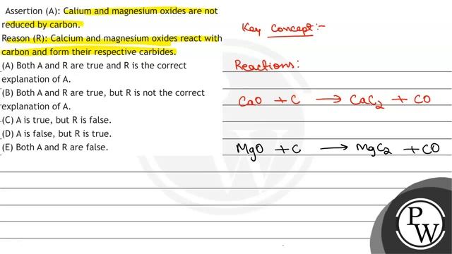 Assertion (A): Calium and magnesium oxides are not reduced by carbon. Reason (R): Calcium and magnesium oxides react with carbon and form their respective carbides. (A) Both A and R are true and R is the correct explanation of A.br(B) Both A and R are true, but R is not the correct explanation of A. (C) A is true, but R is false. (D) A is false, but R is true. (E) Both A and R are false. 📲PW App Link - https://bit.ly/YTAI_PWAP 🌐PW Website - https://www.pw.live