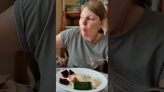 Мукбанг. Яичница с беконом, отварная свекла, малосольный огурец