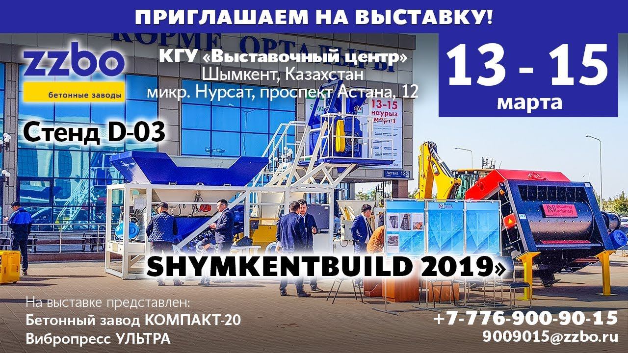 Выставка «SHYMKENTBUILD 2019» объявляется открытой! В городе Шымкент, Республики Казахстан, мы представляем бетонный завод КОМПАКТ-20 и Вибропресс УЛЬТРА. Выставка продлится с 13 по 15 марта! Стенд ZZBO — D-03! КГУ «Выставочный центр». Республика Казахстан, г. Шымкент, микр. Нурсат, проспект Астана, 12.