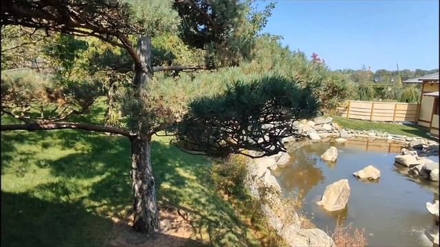Пруд с золотыми карпами, каскад водопадов и красивая галерея построек.