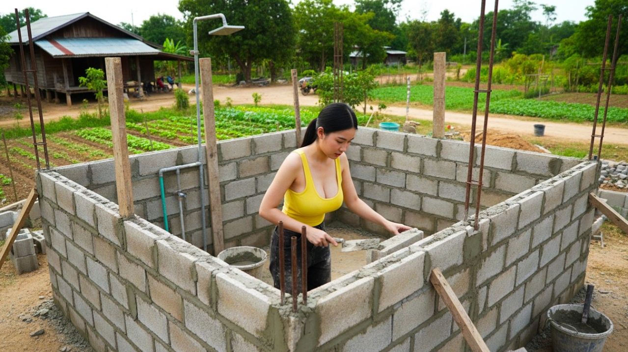 Девушка-строит автономную ванную комнату из бетонных блоков и с продуманной системой дренажа