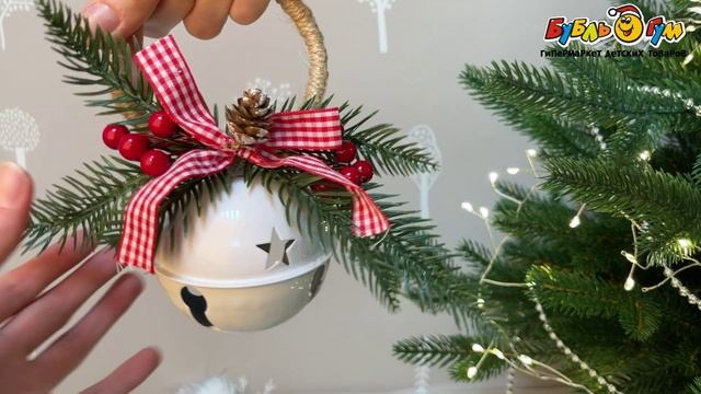 333582 Украшение новогоднее Бубенец с бантом и красными ягодами белый 9см