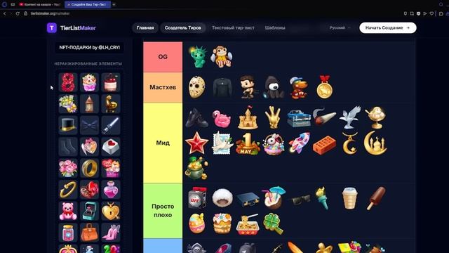 СОСТАВЬ СВОЙ ТИРЛИСТ - https://t.me/lh_crypto1/10712 ✅ Полезные сервисы: ТГ-канал - https://t.me/lh_crypto1 Приватный канал - https://t.me/lh_crypto1/8439 Купить и продать TG-звезды - https://t.me/lh_tgstars_bot Купить и продать TON - https://t.me/lh_tonbuy_bot Купить рефералов - https://t.me/lhrefs Наши чаты - https://t.me/leanchatik Эпоха интересного и разнообразного контента продолжается — я ебанул часовой видос, где ВСЕ NFT-подарки распределил в тирлист, который вы в скором времени тоже сможете заполнить. Так что гоу по ссылке смотреть, кого я поставил в OG-категорию, а кого "унизил". Ну и про конкурс не забывайте. 00:00 Что такое тир-лист? 01:43 Составляем тир-лист. 54:36 Итоги. 55:46 Бонус. Автор канала — https://t.me/lhmanag Зарабатывай на схемах - https://clck.ru/3EYXhF #leanhustle #nft #заработок