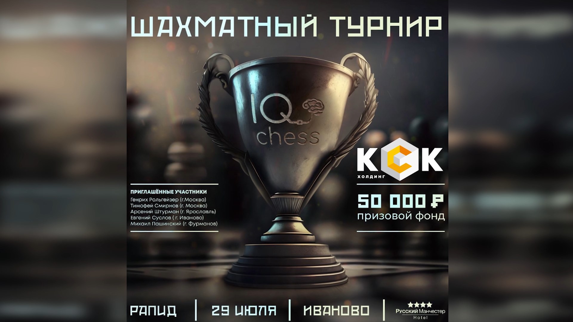 29 июля 2023 года в ивановской гостинице «Русский Манчестер» состоялся шахматный турнир по рапиду. Партнером мероприятия выступил Холдинг КСК. Призовой фонд от спонсора составил 50 тысяч рублей. Победитель турнира Арсений Штурман получил от КСК приз в размере 20 тысяч рублей. #ХолдингКСК #Иваново #новостройки #строительство #шахматы