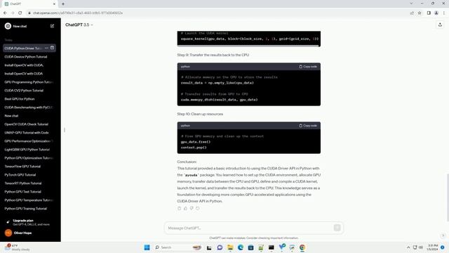 Download this code from https://codegive.com Title: Getting Started with CUDA Driver API in Python Introduction: CUDA (Compute Unified Device Architecture) is a parallel computing platform and application programming interface model created by NVIDIA. It allows developers to harness the power of NVIDIA GPUs for general-purpose computing. In this tutorial, we'll explore the CUDA Driver API and how to use it in Python to accelerate computations on NVIDIA GPUs. Prerequisites: CUDA Driver API Overview: The CUDA Driver API provides a lower-level interface compared to the CUDA Runtime API, giving developers more control over GPU resources and execution. The Python CUDA package, pycuda, facilitates interaction with the CUDA Driver API. Step 1: Install the required packages Step 2: Set up the CUDA Driver API in Python Step 3: Query and select a CUDA device Step 4: Create a CUDA context Step 5: Allocate GPU memory Step 6: Transfer data between CPU and GPU Step 7: Define and compile a CUDA kernel Step 8: Launch the CUDA kernel Step 9: Transfer the results back to the CPU Step 10: Clean up resources Conclusion: This tutorial provided a basic introduction to using the CUDA Driver API in Python with the pycuda package. You learned how to set up the CUDA environment, allocate GPU memory, transfer data between the CPU and GPU, define and compile a CUDA kernel, launch the kernel, and transfer the results back to the CPU. This knowledge serves as a foundation for developing more complex GPU-accelerated applications using the CUDA Driver API in Python. ChatGPT