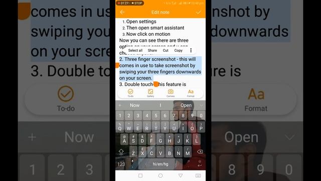 1. Flip to mute - this option comes in use to mute incoming calls when you are not interested to take that call. 2. Three finger screenshot - this will comes in use to take screenshot by swiping your three fingers downwards on your screen. 3. Double touch- This feature is comes in use to turn on your mobile screen by double tap on off screen. For more please subscribe and like?