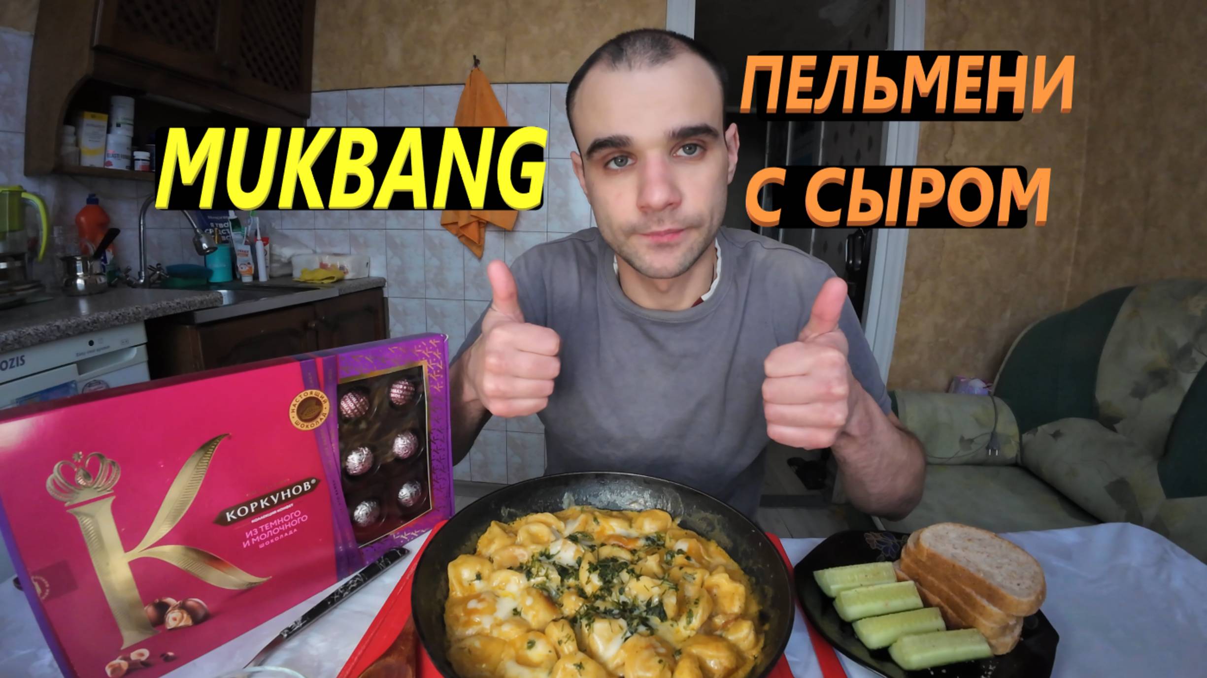 МУКБАНГ ПЕЛЬМЕНИ С СЫРОМ ЖАРЕНЫЕ / ХЛЕБ / ОГУРЕЦ / КОНФЕТЫ ШОКОЛАДНЫЕ / EATING MUKBANG ASMR АСМР