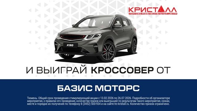 С 13 февраля по 26 июля регистрируй любые чеки за покупки в магазинах, кинотеатрах, кафе или ресторанах ТРЦ «Кристалл», и выиграй кроссовер от «Базис Моторс»! Чтобы принять участие в розыгрыше автомобиля: 1. Совершай покупки в любом магазине, кафе, кинотеатре и ресторане ТРЦ «Кристалл». 2. Регистрируй все свои бумажные или электронные чеки на любую сумму здесь: promo.trc-kristall.ru 3. За каждые полные 5 000 рублей суммы зарегистрированных чеков получи электронный купон участника акции. 4. Приходи на розыгрыш автомобиля 26 июля в 17:00 в ТРЦ «Кристалл»! *Розыгрыш проводится только среди присутствующих