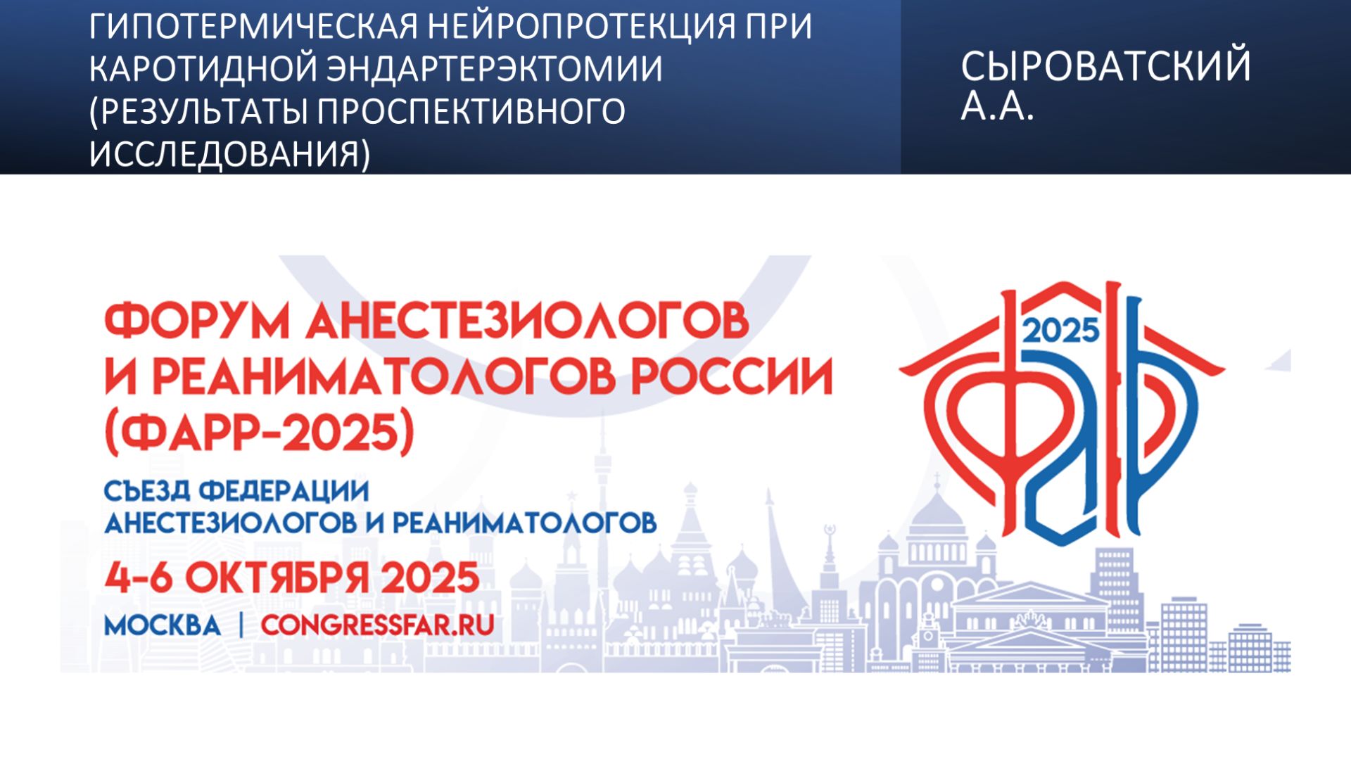 Видеозапись ФАРР-2025, XXIII съезд Федерации анестезиологов и реаниматологов 04-06 октября 2025, Москва. Алексей Андреевич Сыроватский "Гипотермическая нейропротекция при каротидной эндартерэктомии (результаты проспективного исследования)" Информация, размещенная на канале, предназначена исключительно для медицинских специалистов