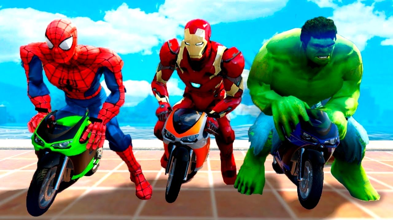 Забавные гонки на мотоциклах. Халк толкает Человека-паука в бассейн. Мультфильм для детей.