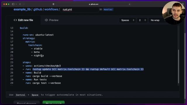 Today we are setting up continuous integration for a Rust project using GitHub Actions! Code: https://github.com/letsgetrusty/example_lib