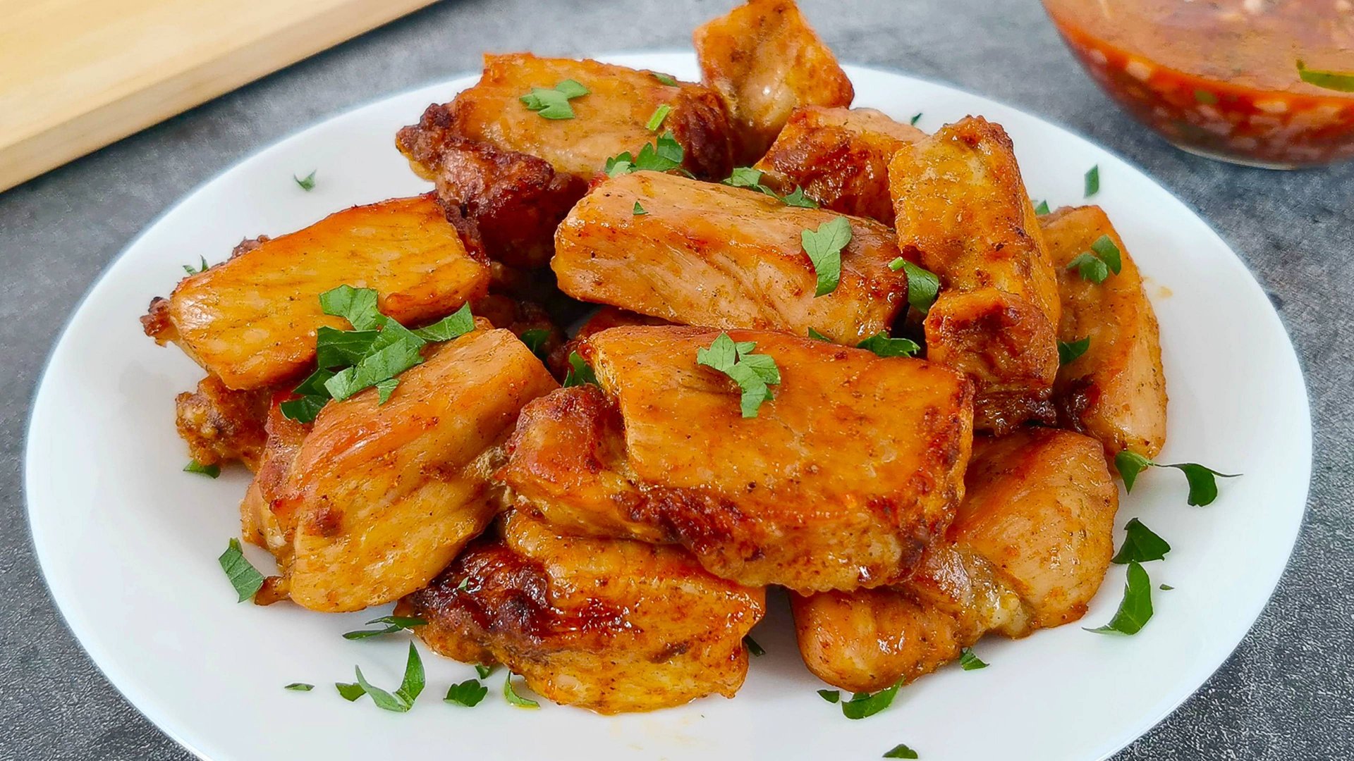 Рецепт: 1 кг. - свинина 1 ч. л. - соль 1/2 ч. л. - хмели-сунели 1 ч. л. - копченая паприка 1/3 ч. л. - черный перец 1/2 ч. л. - сухой чеснок 1 шт. - репчатый лук Петрушка Соус: 2 ч. л. - кетчуп 1 ч. л. - сахар 2 ст. л. - растительное масло Соль по вкусу 1/5 ч. л. - черный перец 50 мл. - вода 1 шт. - репчатый лук Петрушка Запекать в духовке 40 мин. при 200°С