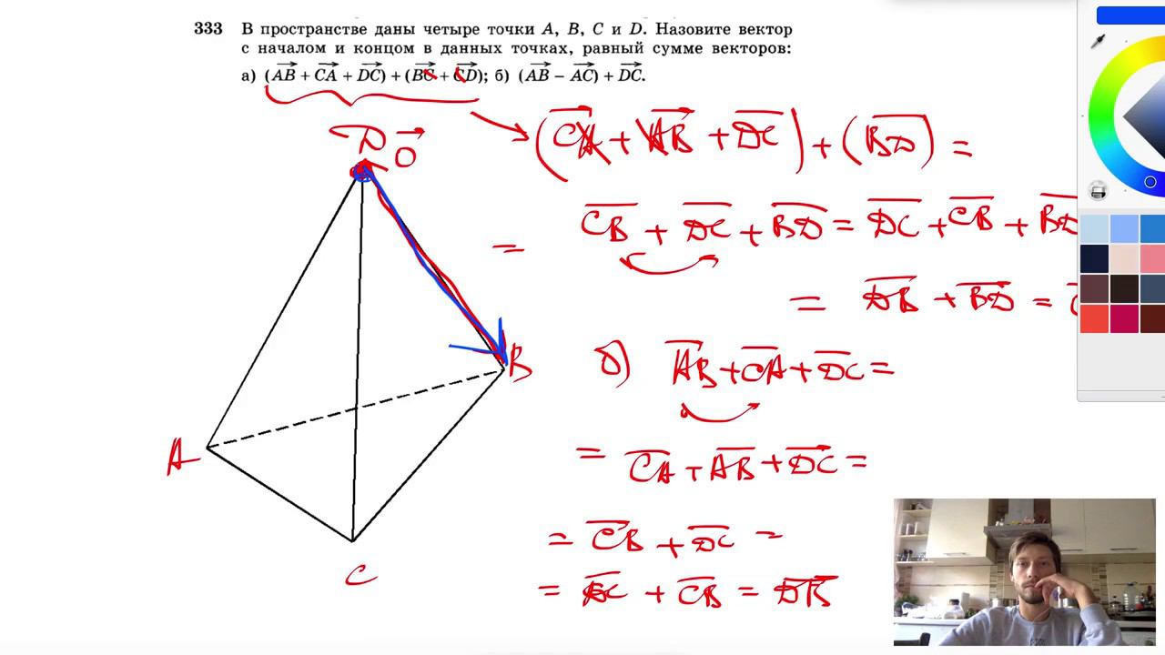 №333. В пространстве даны четыре точки А, В, С и D. Назовите вектор с началом и концом в данных точках, равный сумме векторов: а) (АВ + СА + DC) + (BC + CD); б) (АВ-АС) + DC. Мой второй канал для подготовки к ЕГЭ и ОГЭ - https://www.youtube.com/ЕвгенийСумин Инстаграм - https://www.instagram.com/EGE_OGE.math Личный инстаграм - https://www.instagram.com/ee_sumin VK - https://vk.com/evgeniysumin FB - https://www.facebook.com/EvgeniySumin