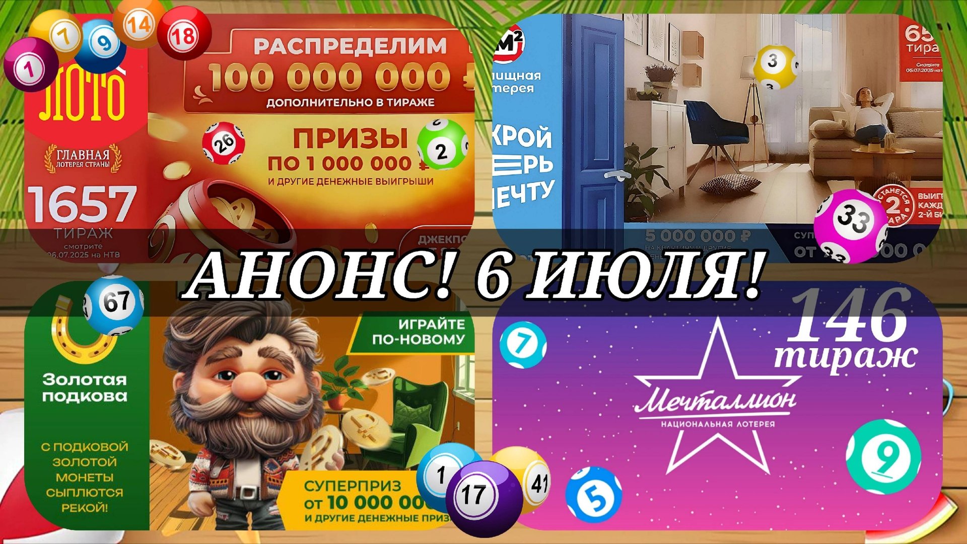АНОНС на 6 ИЮЛЯ.РУССКОЕ ЛОТО 1657| ЖИЛИЩНАЯ №658|ЗОЛОТАЯ ПОДКОВА №514| МЕЧТАЛЛИОН №146.