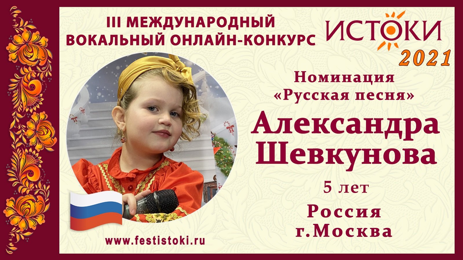 Лауреат I степени III Международного вокального онлайн-конкурса «Истоки». Номинация "Русская песня". Песня "Самовар" Авторы Юрий Энтин, Давид Тухманов. Сайт: www.festistoki.ru / www.festistoki.com E-mail: festistoki@mail.ru