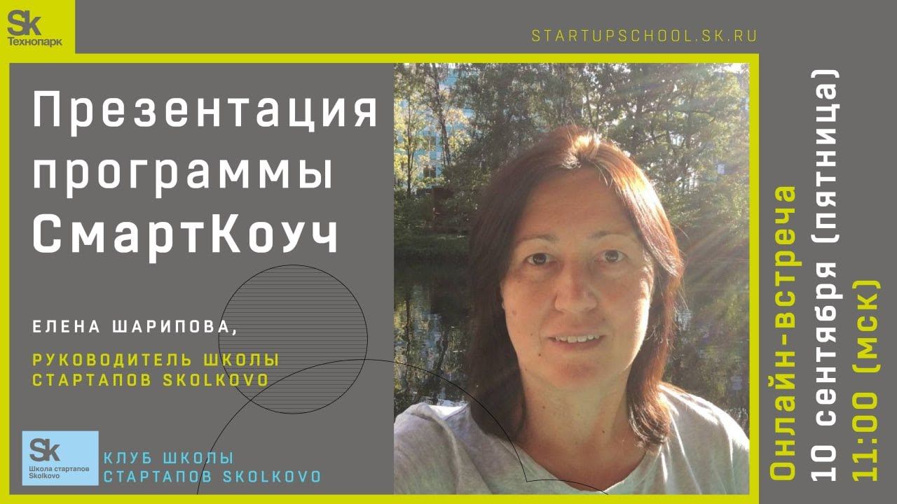 Спикер: Елена Шарипова, руководитель Школы стартапов Skolkovo в Технопарке "Сколково". Сайт Школы: startupschool.sk.ru Подробнее о программе СмартКоуч и подача заявок здесь: https://startupschool.sk.ru/smart-coach Презентация доступна по ссылке: https://drive.google.com/file/d/1jWD9HQCFMLMeEb9qn_ZXbgIQRt82ZuQc/view?usp=sharing __ 0:00:00-0:37:55 - Презентация программы СмартКоуч 0:38:45-0:47:12 - Примеры расчасовки внутри Треков (направлений) 0:47:13 - 1:34:43 - Ответы на вопросы участников