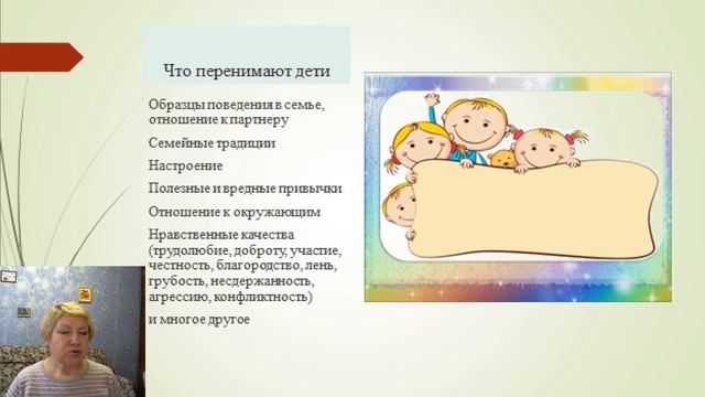 Каждая семья несёт ответственность за воспитание своих детей и за качества, которые она им прививает. О влиянии родительского примера на формирование личности детей расскажет вам воспитатель 1 категории Корсакова Маргарита Алексеевна.