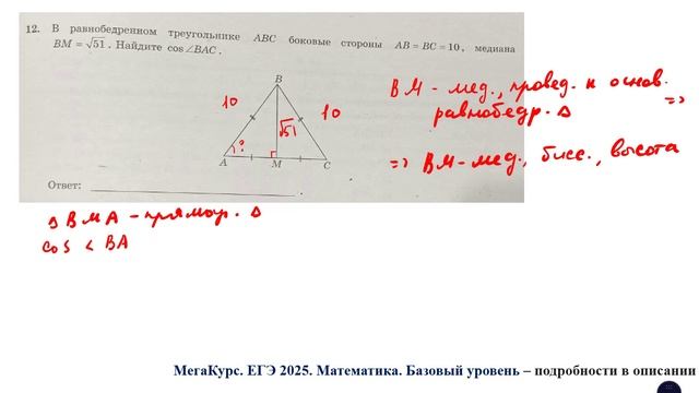 Задание 12 из базового уровня ЕГЭ по математике: В равнобедренном треугольнике АВС боковые стороны АВ = ВС = 10, медиана ВМ = ... Найдите косинус угла ВАС. Курс по всем заданиям 1 - 21 базового уровня ЕГЭ по математике: https://stepik.org/a/174709 Группа ВК: https://vk.com/egeroombaza #егэ #математика #база