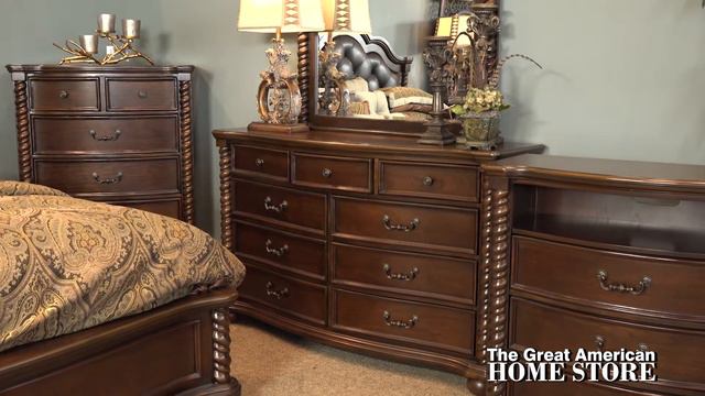 The Montarosa Bedroom Suite makes you feel like royalty night after night and adds an instant boost of elegance to any bedroom. The Montarosa Bedroom Collection easily creates a distinctive space with its highly decorative take on traditional and Baroque-inspired style. The sophisticated design creates an awe-inspiring presence and draws attention with elegant carvings throughout the collection. Button-tufted polyurethane adds a soft backing for extra comfort that helps increase the visual appeal of the design. Twisted rope accents flank each side of the headboard all sitting on bun feet are found throughout the collection to give it a cohesive look. This set’s elaborate details and rich walnut finish further contribute to its traditional design. This collection is built from solid pine with a walnut finish and features a combination of French & English dovetail drawer construction, velvet-lined top drawers for valuables, and dust-proof bottom drawers for clothes. All on full-extension ball-bearing side glides. The dresser offers nine drawers and the chest offers plenty of room with six drawers, there's no shortage of storage here. The queen bed height is 73 inches tall with a width of 67 and ¾ inches and an overall depth of 81 inches. King bed measures 73 inches tall with a width of 81 and ¾ inches and an overall depth of 81 inches. The 9 drawer dresser measures 64 inches wide with a height of 40 inches and a depth of 19 inches. When you add the mirror the overall height is 82 inches. The 3 drawer nightstand is 30 and ¼ inches wide by 28 inches high and depth of 17 and ¾ inches front to back. For added storage, the five drawer chest is 39 inches wide 52 and ¼ inches high, and depth of 18 inches. This collection also offers a media chest with 3 drawers and an open shelf that measures 40 inches wide and a height of 40 inches with a depth of 18 inches. This collection is top rated and we encourage you to see the reviews. Shop online or visit one of our convenient locations to see our complete selection of bedroom suites offering all the latest styles as well as great value.
