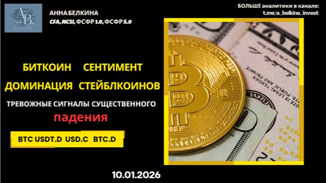 Биткоин, сентимент и доминация стейблкоинов – 🔽 тревожные сигналы для развития существенного падения🔽 Необходимость подтянуть стоп по биткоину обусловлен тем, что развитие движения наверх слишком слабое, а по доминации стейблкоинов (%) есть возможность продолжить движение наверх, что соответствует продолжению состояния риск-офф на рынке крипты. Глобально, структура развития падения на биткоине может формироваться через начальную диагональ в волне a of (ii). Только так снижение может продолжиться вниз с поставленным с исторических верхов двойным зигзагом, который является лишь субволной (частью) нисходящего движения. Поэтому крайне важно сейчас сконцентрировать внимание на риск-менеджменте. Подтянуть стопы, ведь если падение подтвердится, биткоин имеет существенный потенциал к падению. Больше разметок в открытом ТГ канале: t.me/a_belkina_invest Подписка на Закрытый канал: https://t.me/MarketViewBot Сайт: https://a-belkina-invest.ru/ Сертификаты: CFA и MCSI (от британского института CISI); ФСФР 1.0 и ФСФР 5.0. Инвестиционный Советник, запись № 232 в реестре ЦБ РФ. Контент имеет информативный характер и не является инвестиционной рекомендацией.