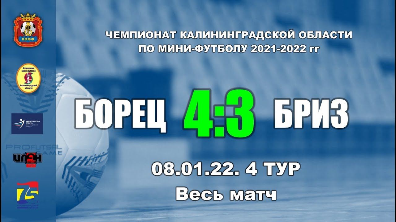 08.01.22. Чемпионат Калининградской области по мини-футболу 4-й тур. «Борец» - «Бриз» 4:3 (1:1). Весь матч Голы забили: Ал.Чаплин (12'), В.Бочаров (38'), Б.Бехбудлу (39', 40') -- А.Крупин (4'), В.Борисюк (26'), П.Дубовской (28') Предупреждены: Н.Григорьев (Б), Б.Бехбудлу (Б), В.Борисюк (Бриз), А.Ишмаев (Бриз) Удалены: Н.Григорьев (Б, 2 ЖК)