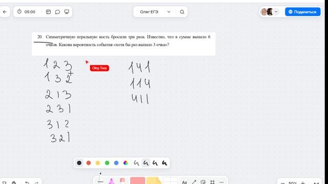 Симметричную игральную кость бросили три раза. Известно, что в сумме выпало 6 очков. Какова вероятность события «хотя бы раз выпало 3 очка»?