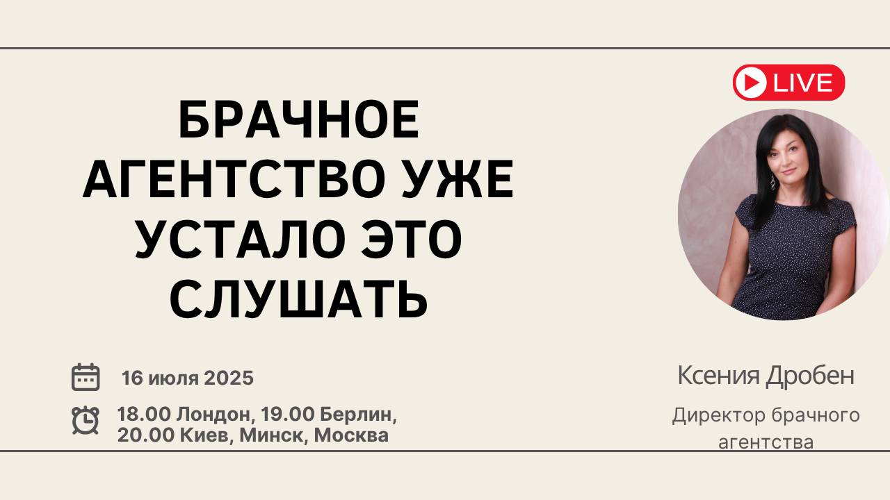 Сегодня у нас среда, день женского вебинара. Сегодняшняя тема «Брачное агентство уже устало это слушать» - и разговарить мы будем о женских органичивающих убеждениях, которые многие из вас пережевывают и пережевывают. Чтобы найти – якобы – убедительное оправдание своему бездействию Приходите послушать, обещаю прекрасную прочистку мозгов Вебинар состоится сегодня, в среду 16 июля Время: 18.00 по Лондону, 19.00 по Берлину, 20.00 по Киеву, Минску и Москве Вебинар пройдет: RuTube - https://rutube.ru/channel/24748934/ YouTube Ksenia Droben https://www.youtube.com/@KseniaDrobenPartnervermittlung Страница Facebook https://www.facebook.com/ksenia.droben VK https://vk.com/kseniadroben Instagram https://www.instagram.com/kseniadroben/ - @kseniadroben Tiktok: @kseniadrobendating Если вы не можете принять участие лично, то сможете посмотреть запись на YouTube или RuTube Жду вас и буду рада ответить на ваши вопросы Наши ближайшие мероприятия: 19 июля – вечеринка знакомств в Мюнхене 20 июля – онлайн вечеринка знакомств 10 июля – Круглый стол 23 августа – вечеринка знакомств в Кельне С уважением Дробен Ксения www.droben-partnervermittlung.de Whatsapp +49 1520 3663653