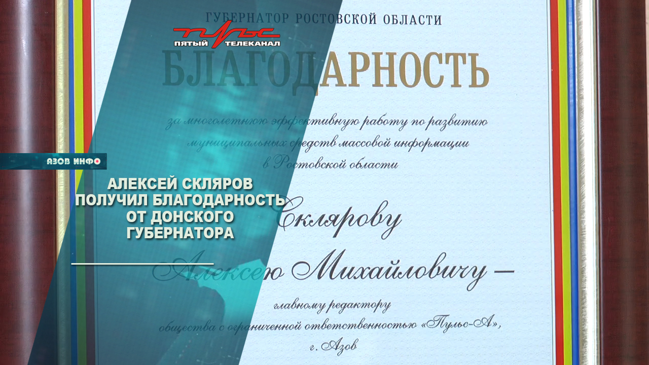 За многолетнюю, эффективную работу по развитию муниципальных средств массовой информации в Ростовской области, главный редактор телекомпании «Пульс» Алексей Скляров был удостоен Благодарности от Донского губернатора Василия Голубева.